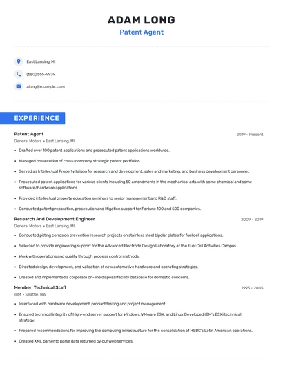 Build a professional patent agent resume in minutes. Browse through our resume examples to identify the best way to word your resume. Then choose from 5+ resume templates to create your patent agent resume.