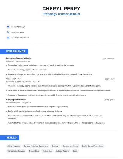 Build a professional pathology transcriptionist resume in minutes. Browse through our resume examples to identify the best way to word your resume. Then choose from 5+ resume templates to create your pathology transcriptionist resume.