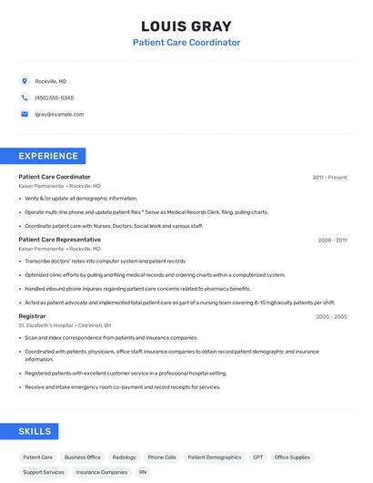 Build a professional patient care coordinator resume in minutes. Browse through our resume examples to identify the best way to word your resume. Then choose from 5+ resume templates to create your patient care coordinator resume.