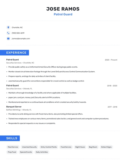 Build a professional patrol guard resume in minutes. Browse through our resume examples to identify the best way to word your resume. Then choose from 5+ resume templates to create your patrol guard resume.