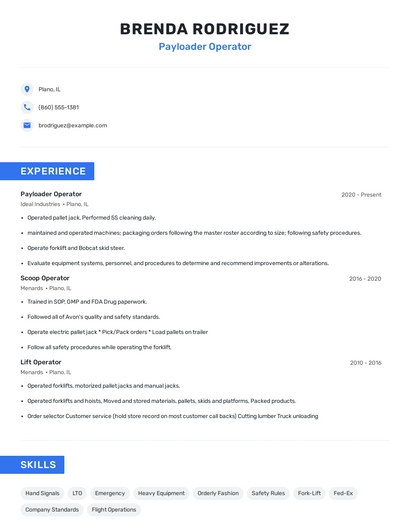 Build a professional payloader operator resume in minutes. Our AI resume writing assistant will guide you through every step of the process, and you can choose from 10+ resume templates to create your payloader operator resume.What skills help Payloader Operators find jobs?