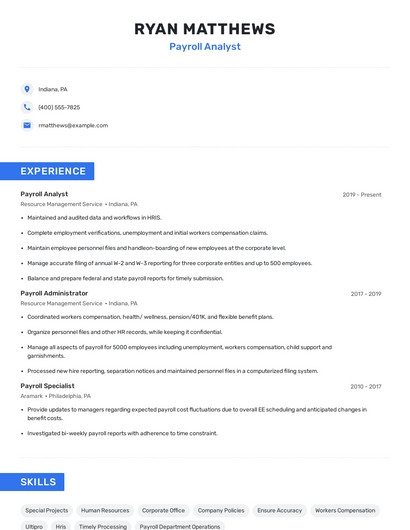 Build a professional payroll analyst resume in minutes. Browse through our resume examples to identify the best way to word your resume. Then choose from 5+ resume templates to create your payroll analyst resume.