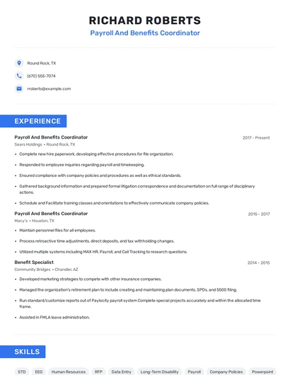 Build a professional payroll and benefits coordinator resume in minutes. Browse through our resume examples to identify the best way to word your resume. Then choose from 5+ resume templates to create your payroll and benefits coordinator resume.