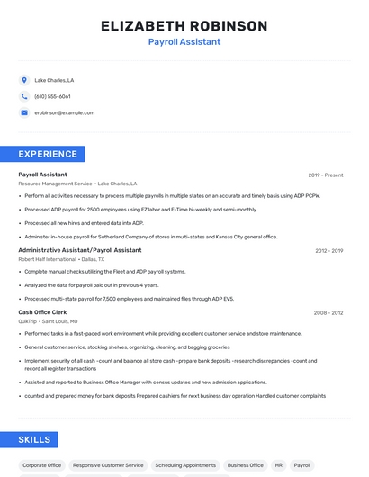 Build a professional payroll assistant resume in minutes. Browse through our resume examples to identify the best way to word your resume. Then choose from 5+ resume templates to create your payroll assistant resume.