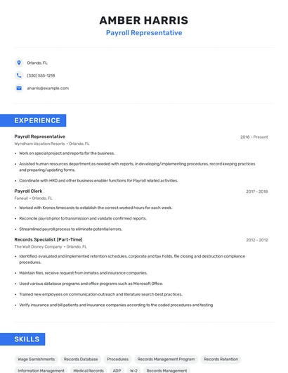 Build a professional payroll representative resume in minutes. Browse through our resume examples to identify the best way to word your resume. Then choose from 5+ resume templates to create your payroll representative resume.