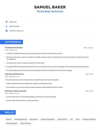 Build a professional pc desktop technician resume in minutes. Browse through our resume examples to identify the best way to word your resume. Then choose from 5+ resume templates to create your pc desktop technician resume.