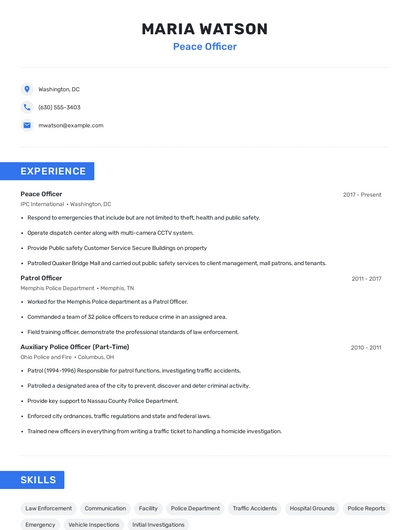 Build a professional peace officer resume in minutes. Browse through our resume examples to identify the best way to word your resume. Then choose from 5+ resume templates to create your peace officer resume.