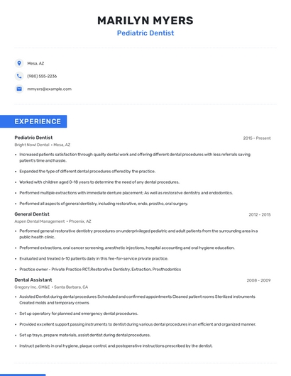Build a professional pediatric dentist resume in minutes. Browse through our resume examples to identify the best way to word your resume. Then choose from 5+ resume templates to create your pediatric dentist resume.