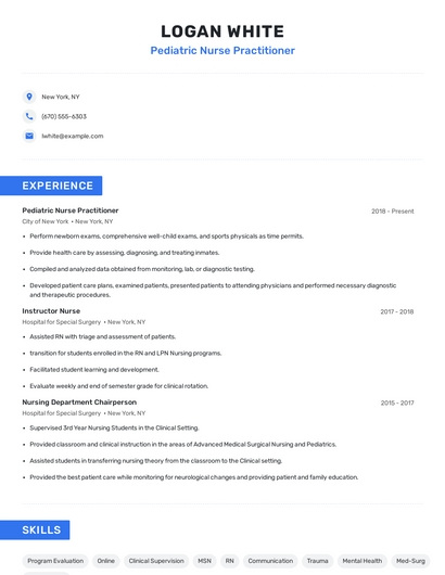 Build a professional pediatric nurse practitioner resume in minutes. Browse through our resume examples to identify the best way to word your resume. Then choose from 5+ resume templates to create your pediatric nurse practitioner resume.