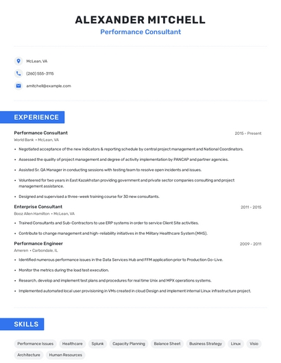 Build a professional performance consultant resume in minutes. Browse through our resume examples to identify the best way to word your resume. Then choose from 5+ resume templates to create your performance consultant resume.