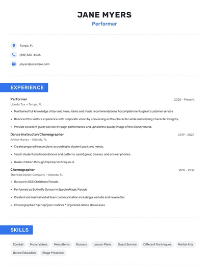 Build a professional performer resume in minutes. Browse through our resume examples to identify the best way to word your resume. Then choose from 5+ resume templates to create your performer resume.