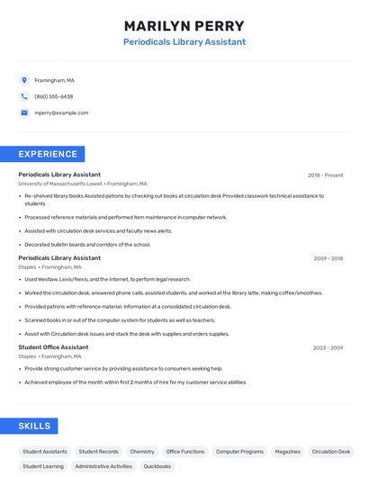 Build a professional periodicals library assistant resume in minutes. Our AI resume writing assistant will guide you through every step of the process, and you can choose from 10+ resume templates to create your periodicals library assistant resume.7. Circulation Desk