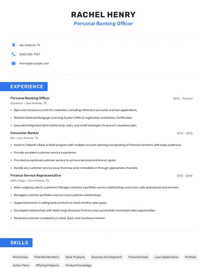 Build a professional personal banking officer resume in minutes. Browse through our resume examples to identify the best way to word your resume. Then choose from 5+ resume templates to create your personal banking officer resume.