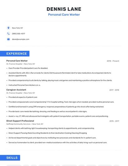 Build a professional personal care worker resume in minutes. Browse through our resume examples to identify the best way to word your resume. Then choose from 5+ resume templates to create your personal care worker resume.