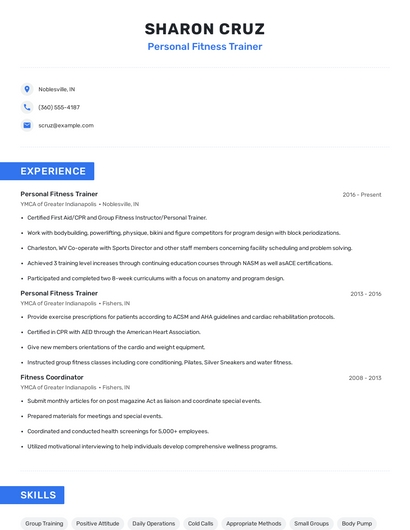 Build a professional personal fitness trainer resume in minutes. Browse through our resume examples to identify the best way to word your resume. Then choose from 5+ resume templates to create your personal fitness trainer resume.