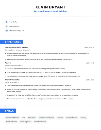 Build a professional personal investment adviser resume in minutes. Browse through our resume examples to identify the best way to word your resume. Then choose from 5+ resume templates to create your personal investment adviser resume.