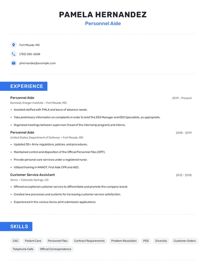 Build a professional personnel aide resume in minutes. Browse through our resume examples to identify the best way to word your resume. Then choose from 5+ resume templates to create your personnel aide resume.