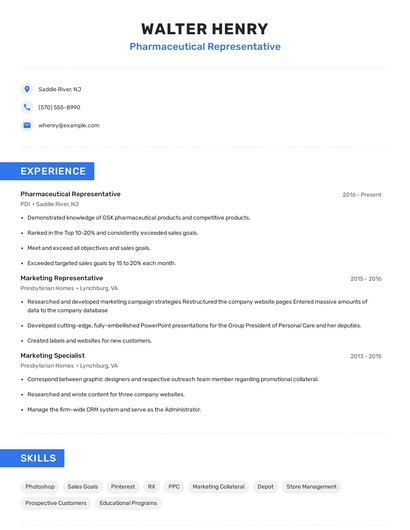 Build a professional pharmaceutical representative resume in minutes. Browse through our resume examples to identify the best way to word your resume. Then choose from 5+ resume templates to create your pharmaceutical representative resume.