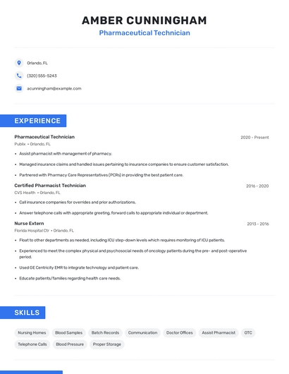 Build a professional pharmaceutical technician resume in minutes. Browse through our resume examples to identify the best way to word your resume. Then choose from 5+ resume templates to create your pharmaceutical technician resume.