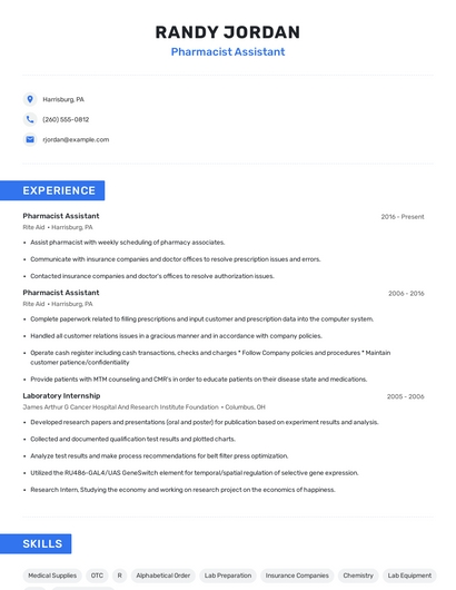 Build a professional pharmacist assistant resume in minutes. Browse through our resume examples to identify the best way to word your resume. Then choose from 5+ resume templates to create your pharmacist assistant resume.