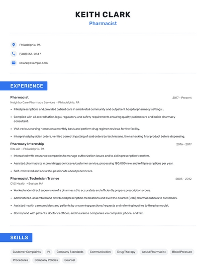 Build a professional pharmacist resume in minutes. Browse through our resume examples to identify the best way to word your resume. Then choose from 5+ resume templates to create your pharmacist resume.