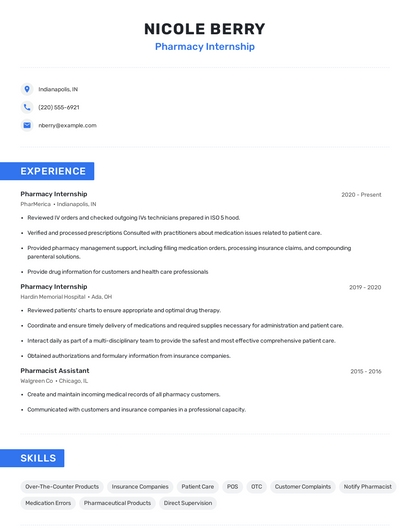 Build a professional pharmacy internship resume in minutes. Browse through our resume examples to identify the best way to word your resume. Then choose from 5+ resume templates to create your pharmacy internship resume.