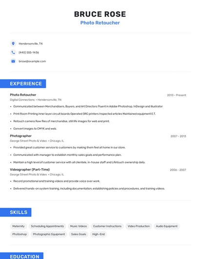 Build a professional photo retoucher resume in minutes. Browse through our resume examples to identify the best way to word your resume. Then choose from 5+ resume templates to create your photo retoucher resume.