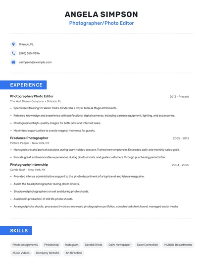 Build a professional photographer/photo editor resume in minutes. Browse through our resume examples to identify the best way to word your resume. Then choose from 5+ resume templates to create your photographer/photo editor resume.