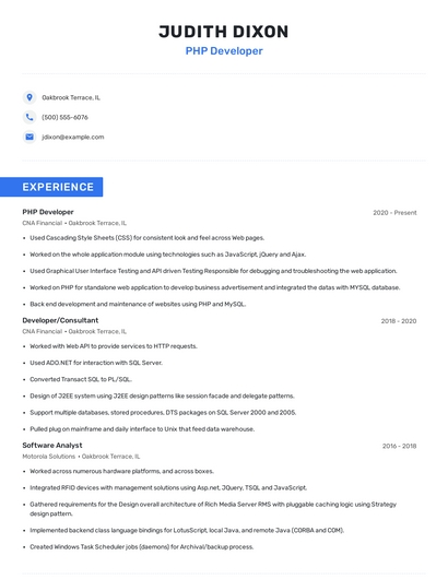 Build a professional php developer resume in minutes. Browse through our resume examples to identify the best way to word your resume. Then choose from 5+ resume templates to create your php developer resume.