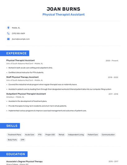 Build a professional physical therapist assistant resume in minutes. Our AI resume writing assistant will guide you through every step of the process, and you can choose from 10+ resume templates to create your physical therapist assistant resume.7. Direct Supervision