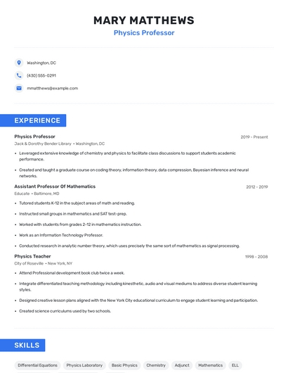 Build a professional physics professor resume in minutes. Our AI resume writing assistant will guide you through every step of the process, and you can choose from 10+ resume templates to create your physics professor resume.7. Geometry