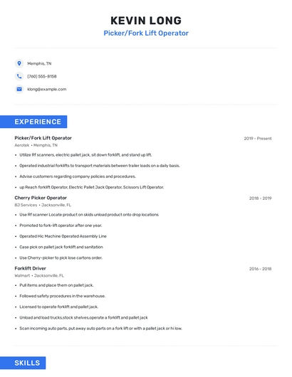 Build a professional picker/fork lift operator resume in minutes. Our AI resume writing assistant will guide you through every step of the process, and you can choose from 10+ resume templates to create your picker/fork lift operator resume.7. Standup