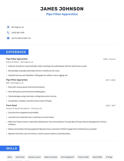 Build a professional pipe fitter apprentice resume in minutes. Browse through our resume examples to identify the best way to word your resume. Then choose from 5+ resume templates to create your pipe fitter apprentice resume.