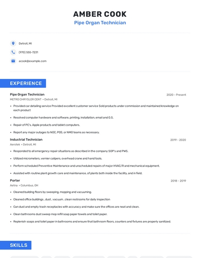 Build a professional pipe organ technician resume in minutes. Our AI resume writing assistant will guide you through every step of the process, and you can choose from 10+ resume templates to create your pipe organ technician resume.7. MIG
