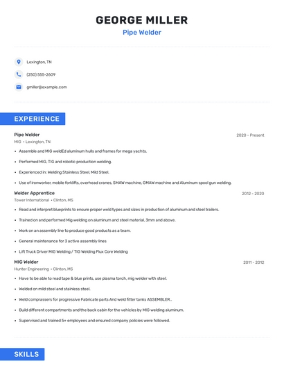 Build a professional pipe welder resume in minutes. Browse through our resume examples to identify the best way to word your resume. Then choose from 5+ resume templates to create your pipe welder resume.