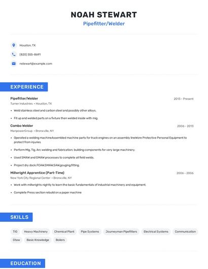 Build a professional pipefitter/welder resume in minutes. Browse through our resume examples to identify the best way to word your resume. Then choose from 5+ resume templates to create your pipefitter/welder resume.
