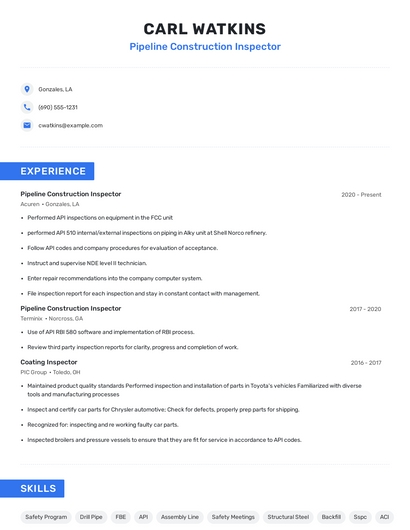 Build a professional pipeline construction inspector resume in minutes. Browse through our resume examples to identify the best way to word your resume. Then choose from 5+ resume templates to create your pipeline construction inspector resume.