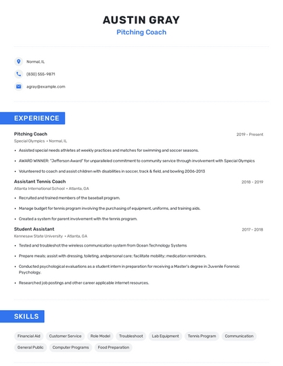 Build a professional pitching coach resume in minutes. Browse through our resume examples to identify the best way to word your resume. Then choose from 5+ resume templates to create your pitching coach resume.