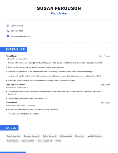 Build a professional pizza maker resume in minutes. Browse through our resume examples to identify the best way to word your resume. Then choose from 5+ resume templates to create your pizza maker resume.