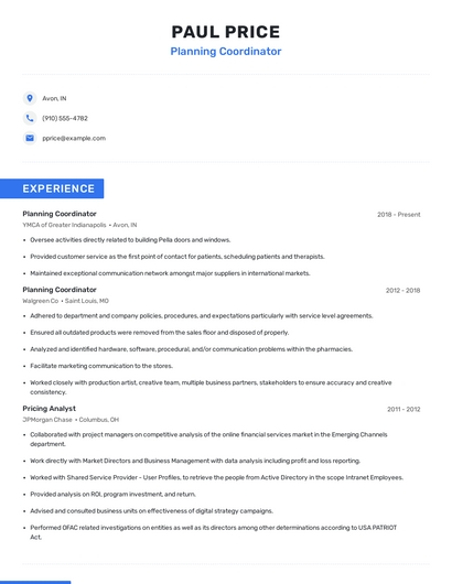 Build a professional planning coordinator resume in minutes. Browse through our resume examples to identify the best way to word your resume. Then choose from 5+ resume templates to create your planning coordinator resume.