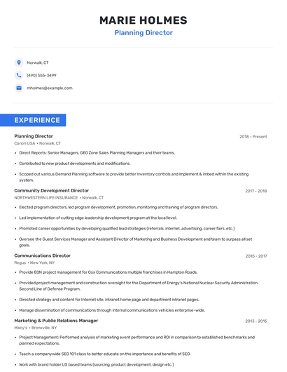 Build a professional planning director resume in minutes. Browse through our resume examples to identify the best way to word your resume. Then choose from 5+ resume templates to create your planning director resume.