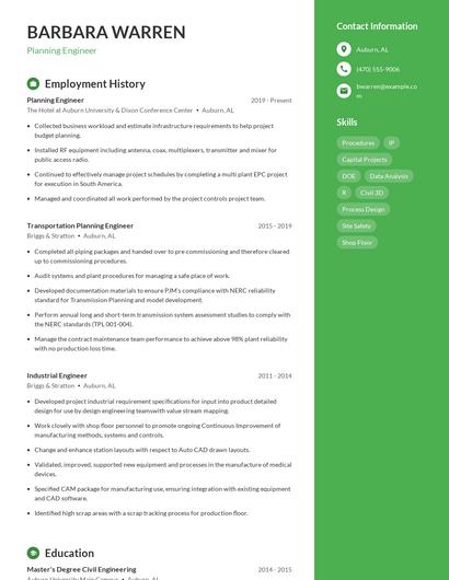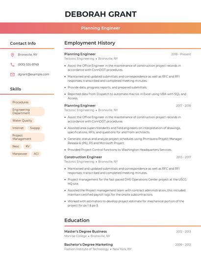 You can use Zippia's AI resume builder to make the resume writing process easier while also making sure that you include key information that hiring managers expect to see on a planning engineer resume. You'll find resume tips and examples of skills, responsibilities, and summaries, all provided by Zippi, your career sidekick.