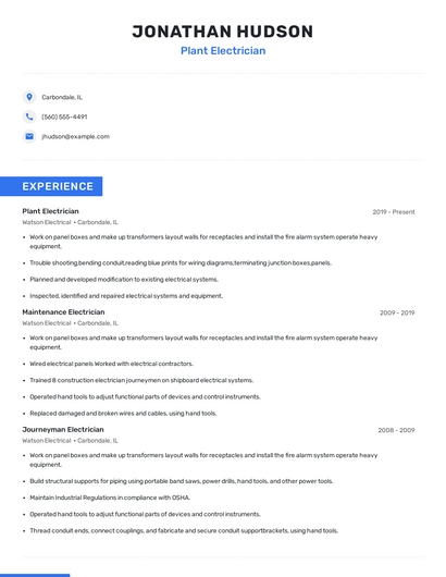 Build a professional plant electrician resume in minutes. Browse through our resume examples to identify the best way to word your resume. Then choose from 5+ resume templates to create your plant electrician resume.