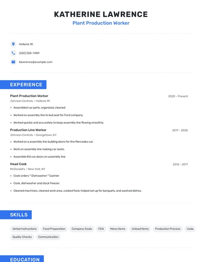 Build a professional plant production worker resume in minutes. Our AI resume writing assistant will guide you through every step of the process, and you can choose from 10+ resume templates to create your plant production worker resume.7. Production Process