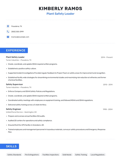 Build a professional plant safety leader resume in minutes. Browse through our resume examples to identify the best way to word your resume. Then choose from 5+ resume templates to create your plant safety leader resume.