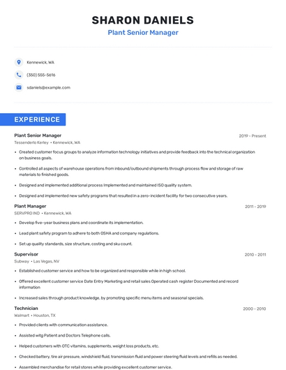 Build a professional plant senior manager resume in minutes. Browse through our resume examples to identify the best way to word your resume. Then choose from 5+ resume templates to create your plant senior manager resume.
