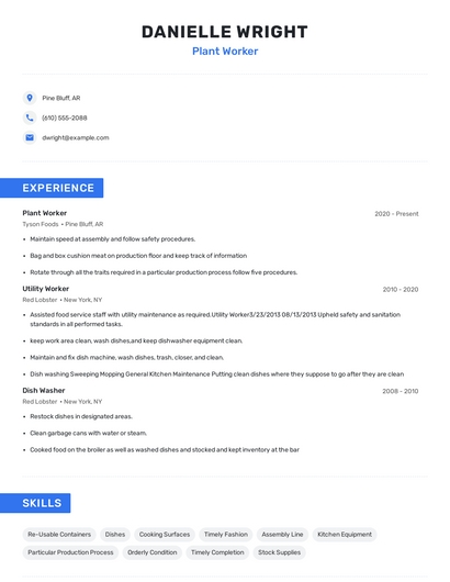 Build a professional plant worker resume in minutes. Browse through our resume examples to identify the best way to word your resume. Then choose from 5+ resume templates to create your plant worker resume.