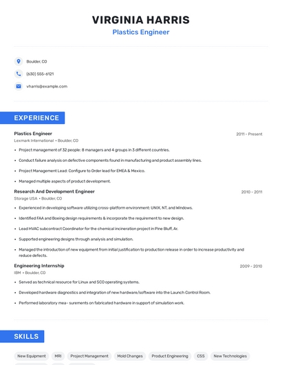 Build a professional plastics engineer resume in minutes. Browse through our resume examples to identify the best way to word your resume. Then choose from 5+ resume templates to create your plastics engineer resume.