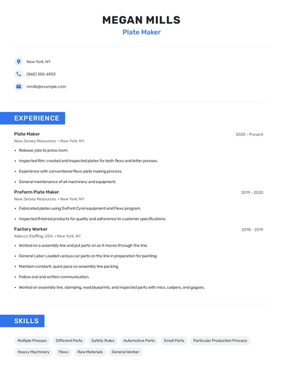 Build a professional plate maker resume in minutes. Browse through our resume examples to identify the best way to word your resume. Then choose from 5+ resume templates to create your plate maker resume.