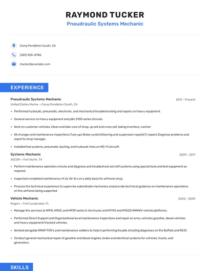 Build a professional pneudraulic systems mechanic resume in minutes. Browse through our resume examples to identify the best way to word your resume. Then choose from 5+ resume templates to create your pneudraulic systems mechanic resume.